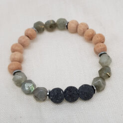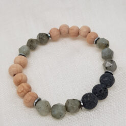 Dieses Armband ist mit Lava-, Labradorit- und Holzperlen.