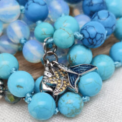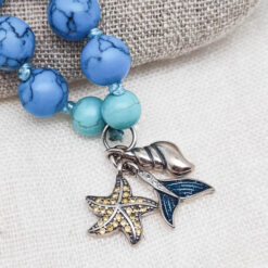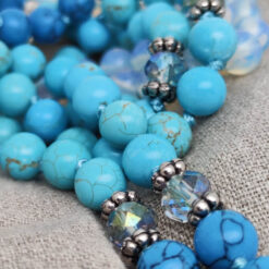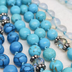 Leuchtendes Türkis, klares Aquamarin und ein Hauch von Weiss – wie Gischt auf sanften Wellen. Blauer Howlith, türkisfarbene Steine und schimmernde Glasperlen spiegeln die Farben tropischer Lagunen wider.