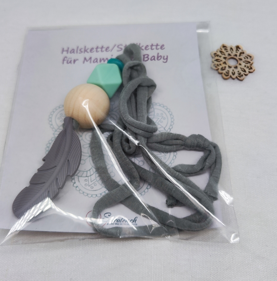 Diese trendige Halskette schmeichelt mit dem weichen Stoffband (aus Baumwolle) schön um den Hals. Sie sieht modisch aus und die Feder ist aus Silikon, so dass auch Ihr Baby Freude daran hat.