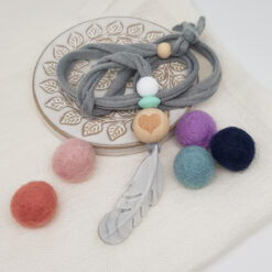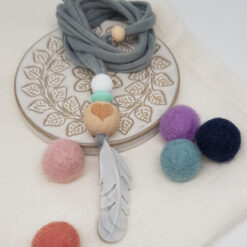 Diese trendige Halskette schmeichelt mit dem weichen Stoffband (aus Baumwolle) schön um den Hals. Sie sieht modisch aus und die Feder ist aus Silikon, so dass auch Ihr Baby Freude daran hat.