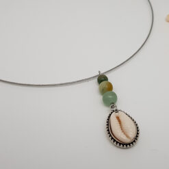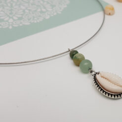 Filigrane Halskette mit einem Muschelanhänger und drei grünen Steinperlen.