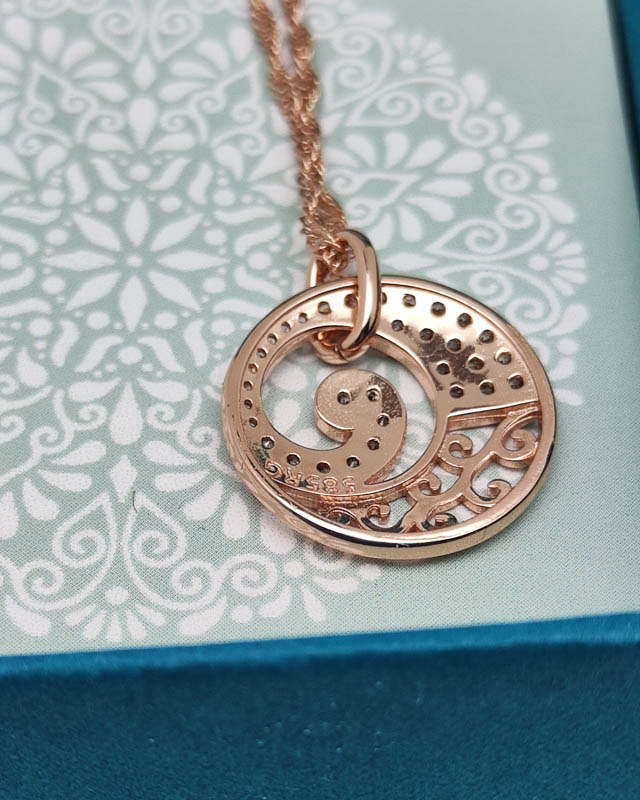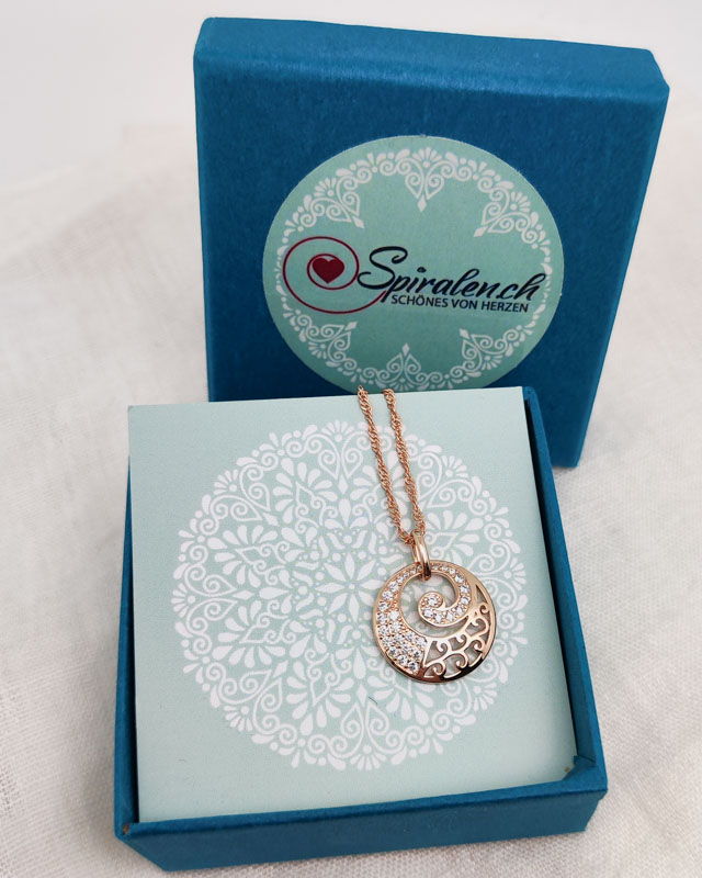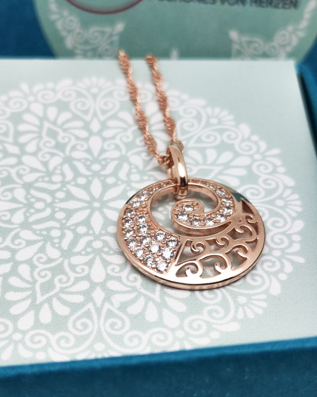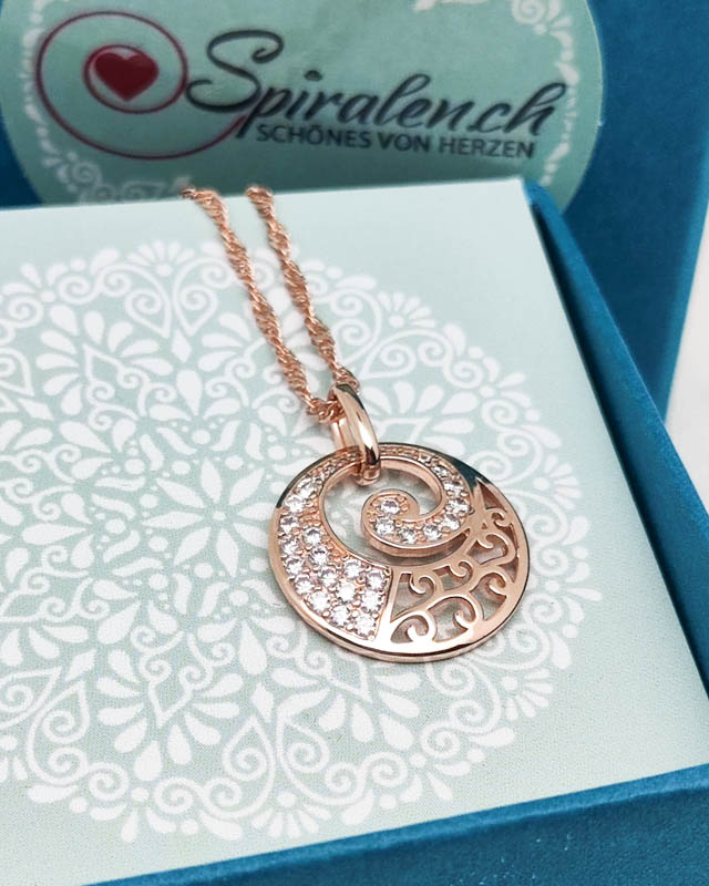 Der runde Anhänger zeigt eine elegant geschwungene Spirale, kunstvoll verziert mit feinen Ornamenten und funkelnden Zirkonia-Steinen, die das Licht auf raffinierte Weise einfangen. Die zarte Twist-Kette ergänzt das Design durch ihren schimmernden Glanz und fliessenden Charakter – leicht, stilvoll und feminin.