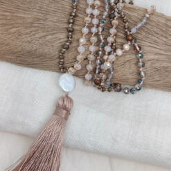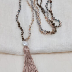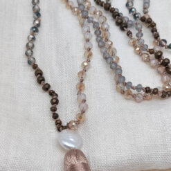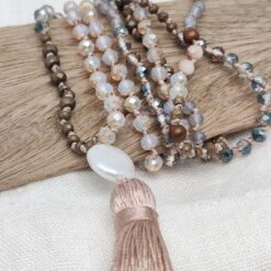 Die edle Ausstrahlung der Süßwasserperle trifft auf das funkelnde Spiel facettierter Glaskristallperlen in sanften Tönen von Taupe, Beige und Altrosa. Die feine Quaste in Rosé-Taupe setzt einen verspielten Akzent.