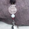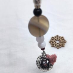 Dünnes Lederband ca. 100cm (verstellbar, auf Wunsch mit Baumwollband) plus Anhänger mit Steinen und Klangkugel ca. 8cm.