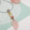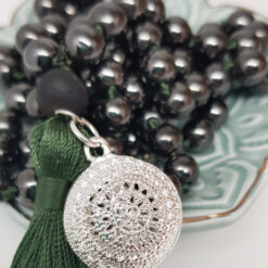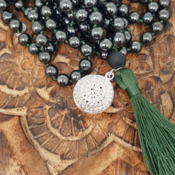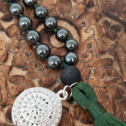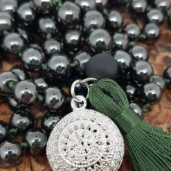 Eine wunderschöne geknöpfte Malakette mit Hämatitperlen und einem Mandalaanhänger. Die Quaste hat ein saftiges Waldgrün.