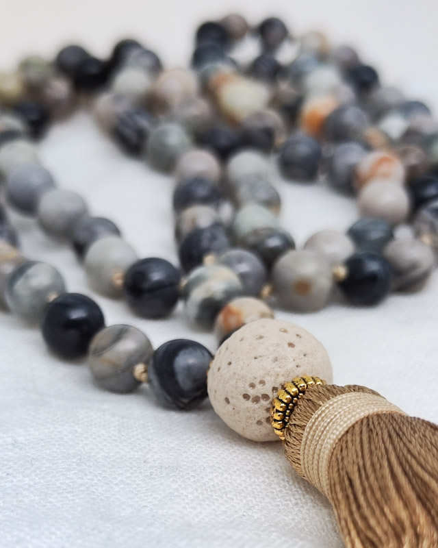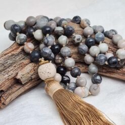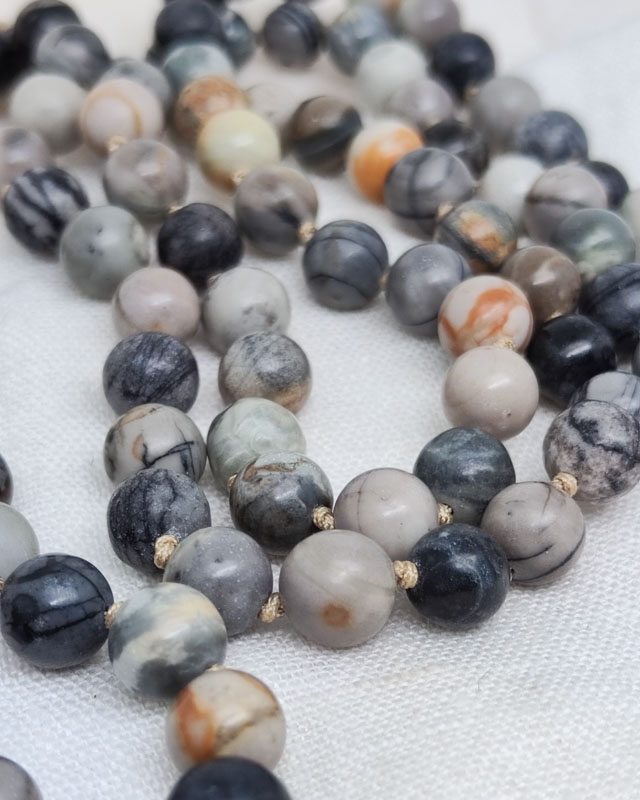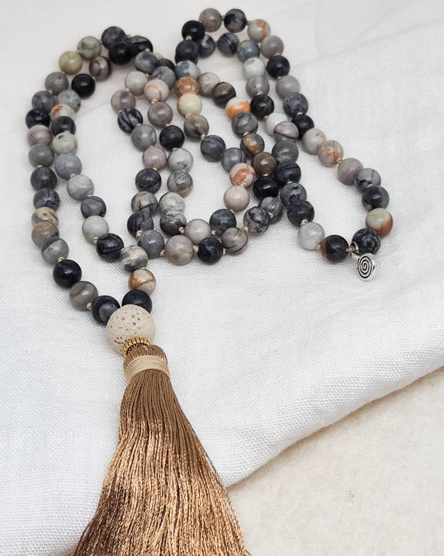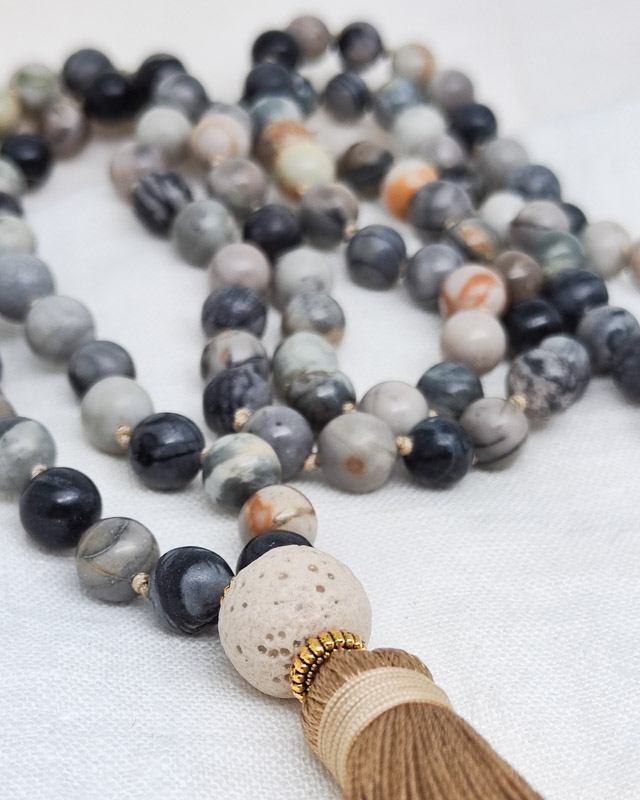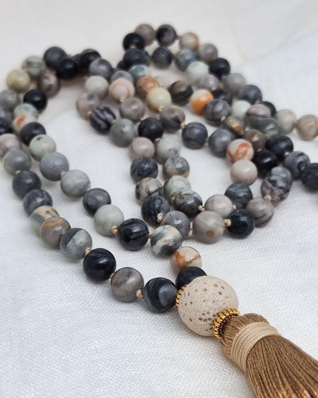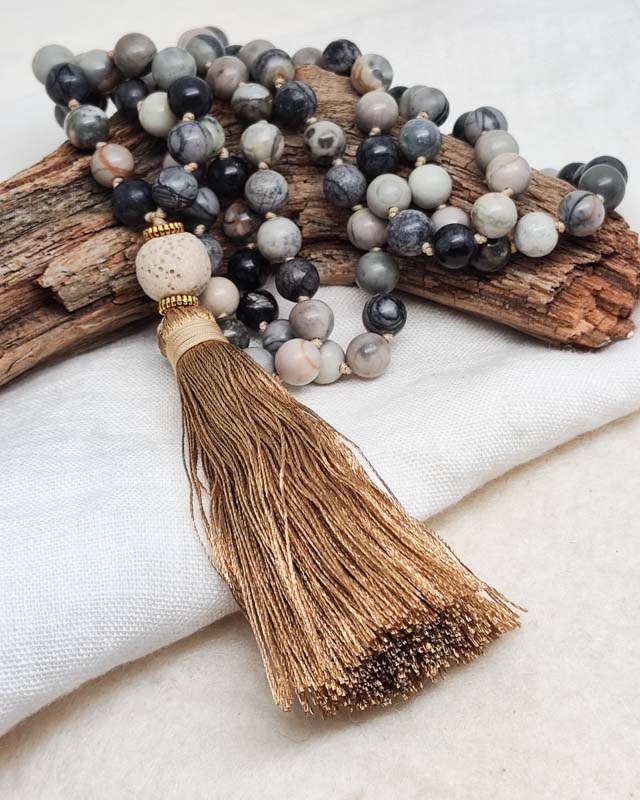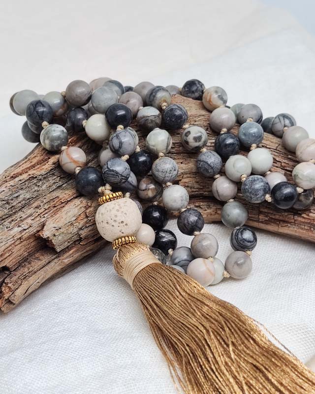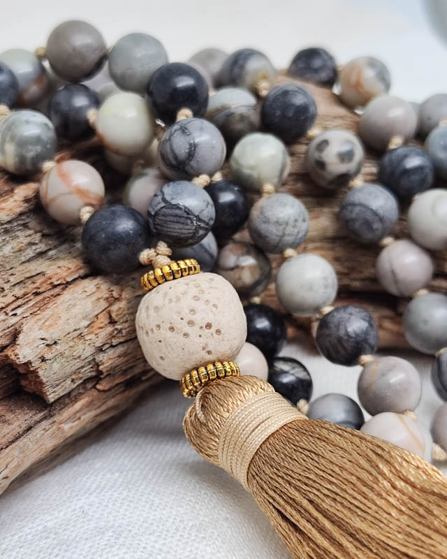 Die Mala-Kette „Bergruhe“ bringt das Gefühl klarer Bergluft und entspannter Momente in der Natur direkt zu dir. Fein gemaserter Picasso-Jaspis in harmonischen Grau- und Beigetönen erinnert mit seinen individuellen Mustern an ruhige Berglandschaften, stille Pfade und lichtdurchflutete Wälder.