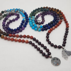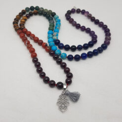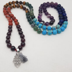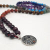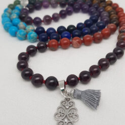 Wunderschöne geknöpfte Malakette mit sieben Edelsteinen, passend zu den sieben Chakras kombiniert mit einem Herzspiralen-Anhänger.