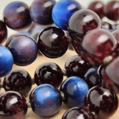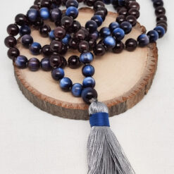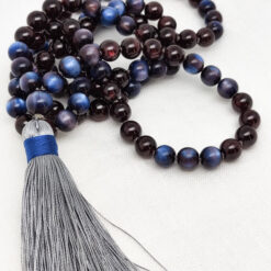 Geknüpfte Mala Gebetskette mit 108 Perlen und einer Tassel/Quaste. Die 108 ist eine heilige Zahl in der Hindu Tradition, denn sie ergibt sich beim Multiplizieren der 12 astrologischen Häuser mit den 9 Planeten. Die Mala hat noch eine zusätzliche Perle, genannt Sumeru oder Meru, die uns an die Lehrer im Leben erinnern soll.