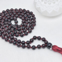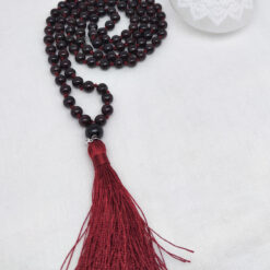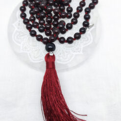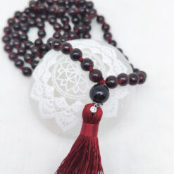 Geknüpfte Mala Gebetskette mit 108 Perlen und einer Tassel/Quaste. Die 108 ist eine heilige Zahl in der Hindu Tradition, denn sie ergibt sich beim Multiplizieren der 12 astrologischen Häuser mit den 9 Planeten. Die Mala hat noch eine zusätzliche Perle, genannt Sumeru oder Meru, die uns an die Lehrer im Leben erinnern soll.