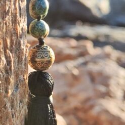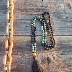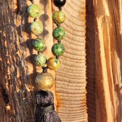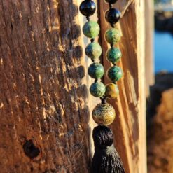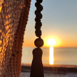 Geknüpfte Mala Gebetskette mit 108 Perlen und einer Tassel/Quaste. Die 108 ist eine heilige Zahl in der Hindu Tradition, denn sie ergibt sich beim Multiplizieren der 12 astrologischen Häuser mit den 9 Planeten. Die Mala hat eine zusätzliche Perle, genannt Sumeru oder Meru, die uns an die Lehrer im Leben erinnern soll.