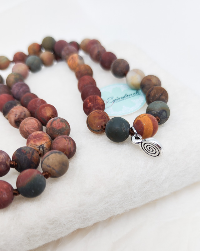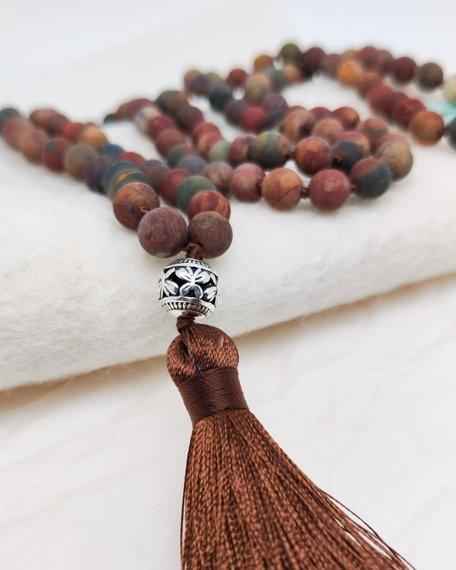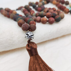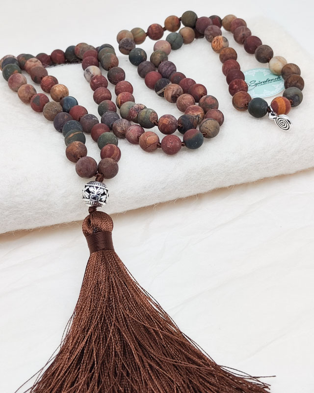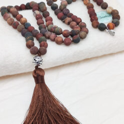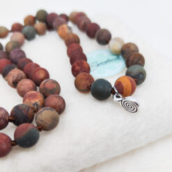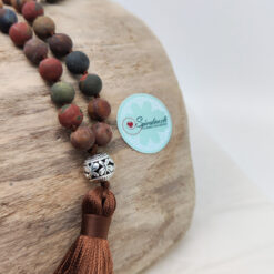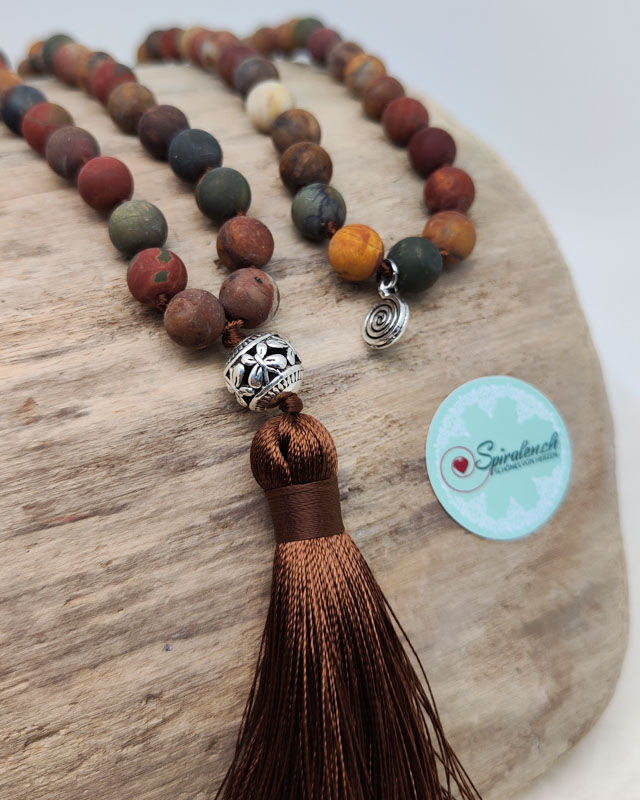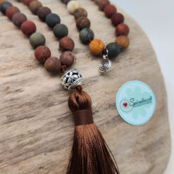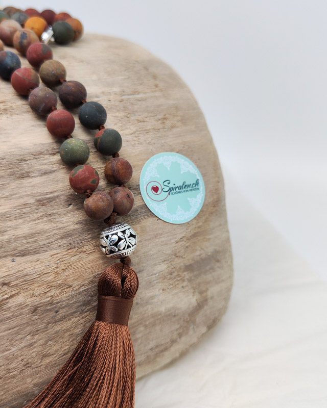 Die Malakette „Terra“ mit Picasso Jaspis vereint die erdigen Farben und Energien der Natur in einem kraftvollen Schmuckstück. Der Picasso Jaspis, der zur Gruppe der Quarze gehört, vereint die warmen Töne von Rot, Gelb, Grün, Sandfarben und Braun, und spiegelt damit die Vielfalt der Erde wider.