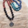 Geknüpfte Mala Gebetskette mit 108 Perlen und einer Tassel/Quaste. Die 108 ist eine heilige Zahl in der Hindu Tradition, denn sie ergibt sich beim Multiplizieren der 12 astrologischen Häuser mit den 9 Planeten. Die Mala hat noch eine zusätzliche Perle, genannt Sumeru oder Meru, die uns an die Lehrer im Leben erinnern soll.