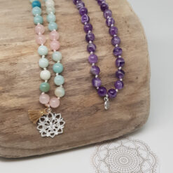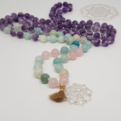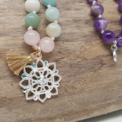 Entdecke die harmonisierende Kraft der Malakette „Wohlfühlen“, eine wohltuende Kombination aus Amethyst, Amazonit und Rosenquarz, gekrönt mit einem floralen Anhänger aus Silber und Zirkonia.