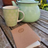 Notizheft, Format A6, Türkis, mit aufgedrucktem Symbol u. Text, weisse Seiten.
