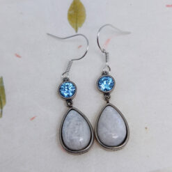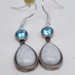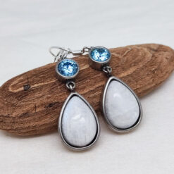 Diese tropfenförmigen Ohrhänger faszinieren mit einem Mondstein und einem hellblauen Zirkon, eingefasst in 925er Silber.
