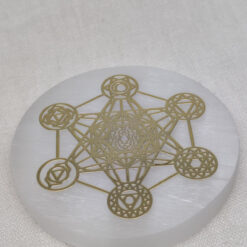 Dieses Symbol, für allumfassende Liebe und Mitgefühl, verbindet die dreidimensionalen Abbilder von 5 platonischen Körpern, welche die fünf Elemente repräsentieren. Dem Tetraeder (Feuer), dem Hexaeder (Erde), dem Oktaeder (Luft), dem Dodekaeder (Äther) und dem Ikosaeder (Wasser). Durch das Übereinanderlegen der platonischen Körper entsteht der Metatron Würfel, der über unterstützende Wirkung verfügt u.a. Blockaden lösen, neue Energie freisetzen, reinigend, Entscheidungen treffen.
