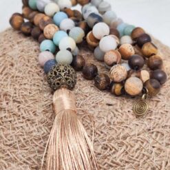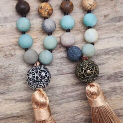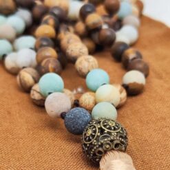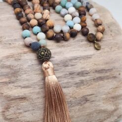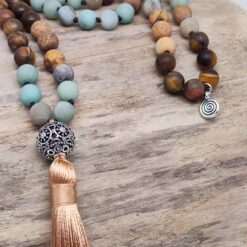 Eine wunderschöne geknüpfte Natursteinkette aus Jaspis, Tigerauge und Amazonit.