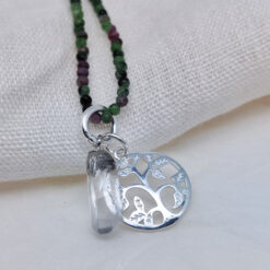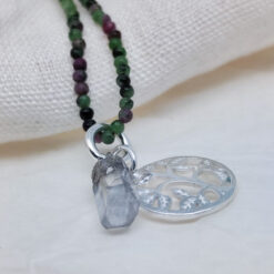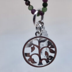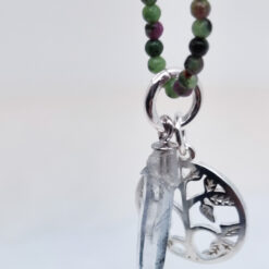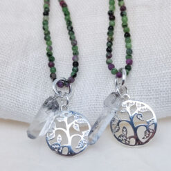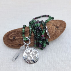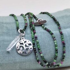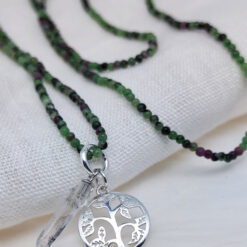 Die Rubin-Zoisit Edelsteinkette ist ein Schmuckstück von aussergewöhnlicher Einzigartigkeit, das eine kraftvolle Mischung aus Energie, Leidenschaft und der Erfüllung persönlicher Träume darstellt. Ihre Besonderheit wird durch den Lemuria-Kristall, ein Symbol für Herzensweisheit und dem Lebensbaum-Anhänger, der u.a. für naturverbundene Harmonie steht, bereichert.