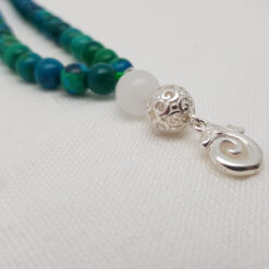 Eine zarte Steinkette in den Grüntönen des Chrysokoll und einem Silberanhänger mit einer Jadeperle.