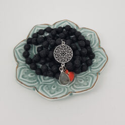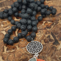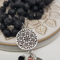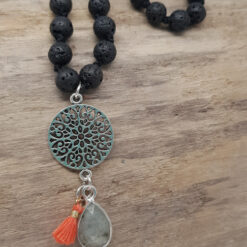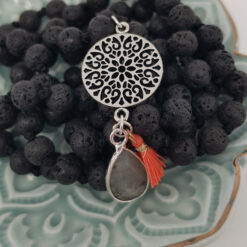 An dieser Steinkette mit den Lavaperlen ist ein Mandala- und ein Labradoritanhänger mit einer kleine Quaste zur Auswahl.