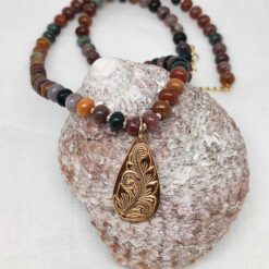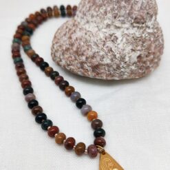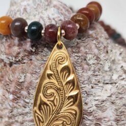 Ein goldig „blühender“ Anhänger mit dem Ocean Jaspis, einem Stein der Freude und des Wohlbefindens.