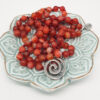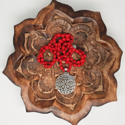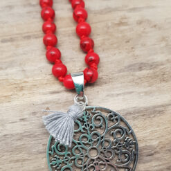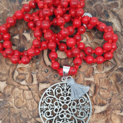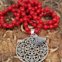 Eine geknöpfte zarte Steinkette in warmen Rot mit einem Mandalaanhänger und einer Quaste.