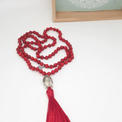 Eine geknöpfte zarte Steinkette in warmen Rot mit einem Buddhaanhänger und einer Quaste.