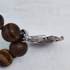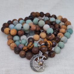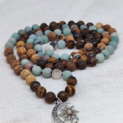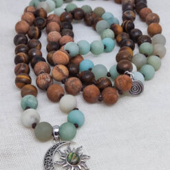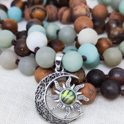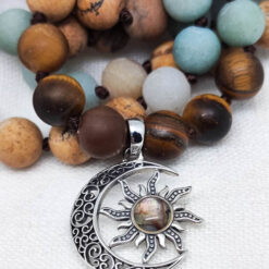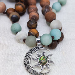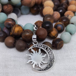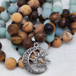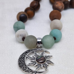 Eine Natursteinkette mit einem Sonne-Mond-Anhänger, die das harmonische Zusammenspiel von Gegensätzen einfängt.