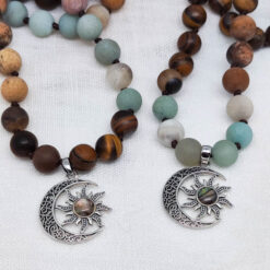 Eine Natursteinkette mit einem Sonne-Mond-Anhänger, die das harmonische Zusammenspiel von Gegensätzen einfängt.